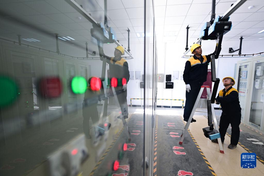 2月5日,中国铁路青藏集团有限公司西宁供电段格尔木检修车间工长王永忠(左)在格尔木南变电所查看机器人运行状况。