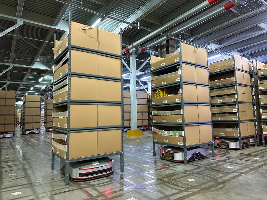 京东物流“地狼”智能机器人正在搬运货架。(新华社记者陈碧琪 摄)