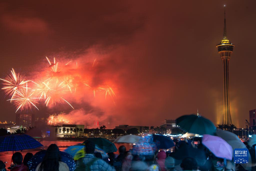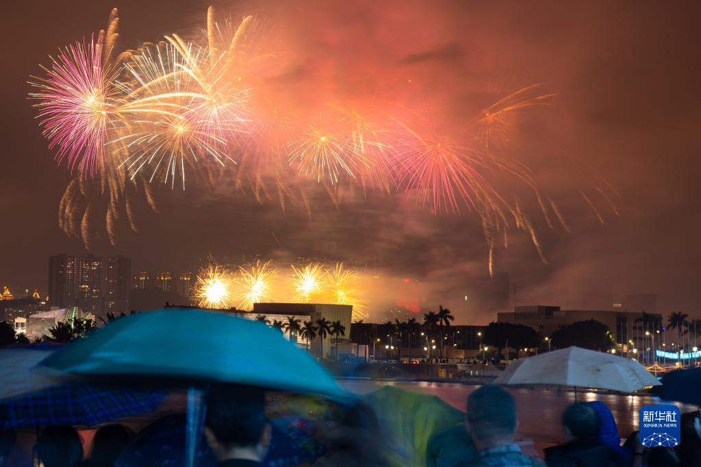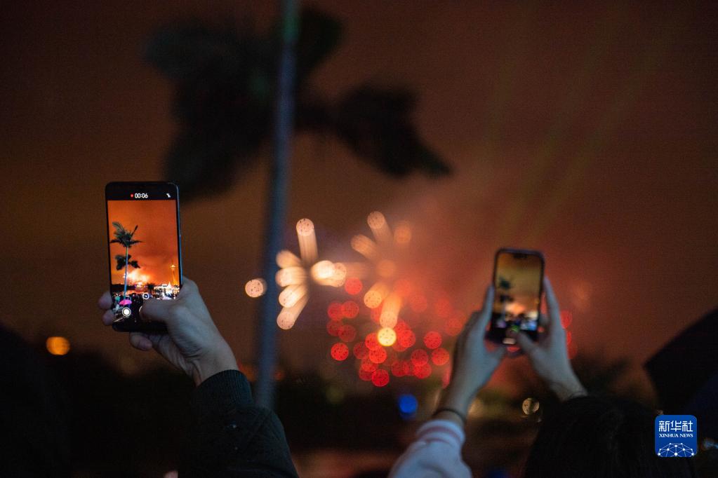 当晚9点,“岁岁平安——绚丽澳门烟花汇演”上演。朵朵烟花在夜空交织绽放,打造多彩绚丽的视觉盛宴。人们纷纷举起手机、相机记录这美丽时刻,在五彩斑斓的焰火中期待新一年。