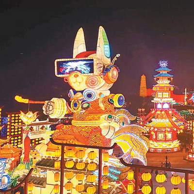 陕西西安城墙灯会,“月中桂兔”灯组绚丽多彩。记者 原韬雄摄