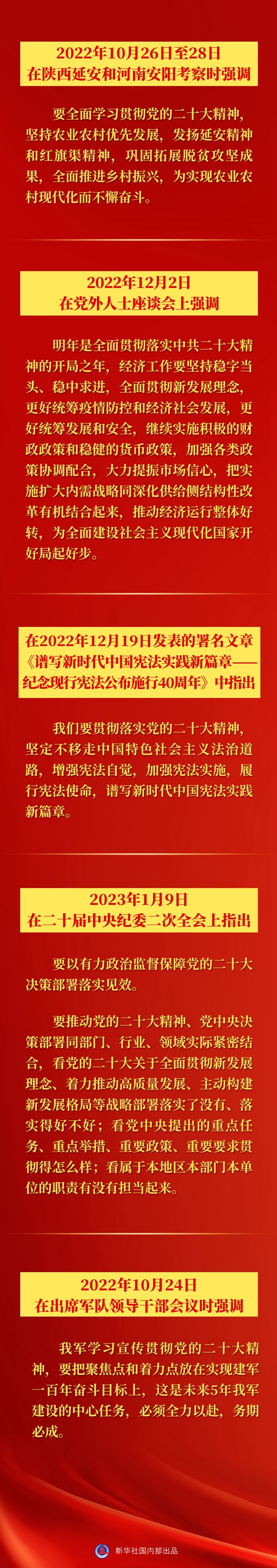 一分部署,九分落实。党的二十大以来,针对各项具体工作,习近平总书记在多个场合就学习贯彻党的二十大精神提出要求——