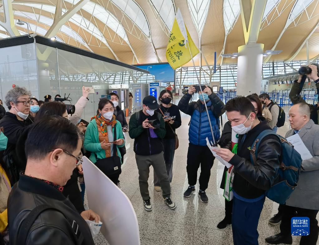 2月6日,在上海浦东国际机场,出境团队游领队师文(举旗者)向游客说明相关注意事项。新华社记者 陈爱平 摄