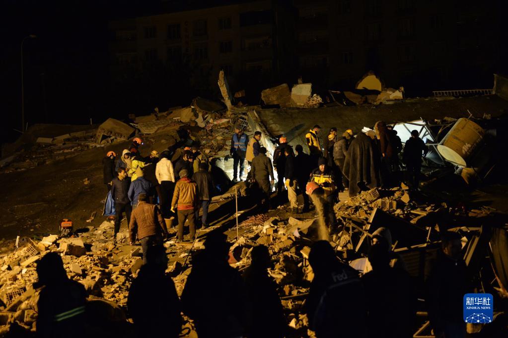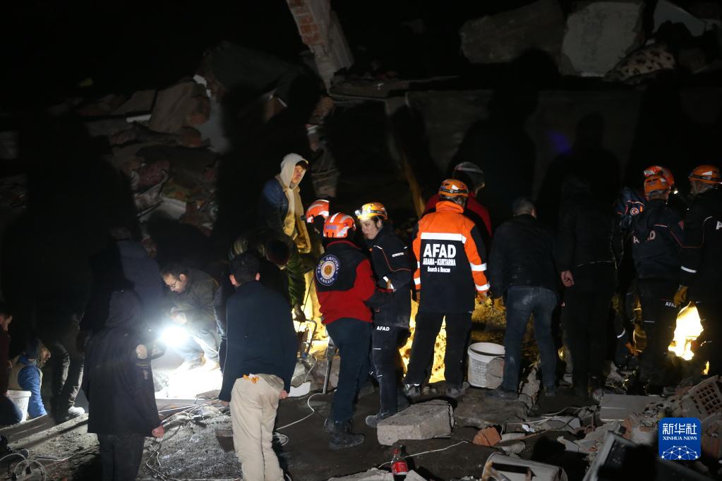 2月6日,救援人员在土耳其南部地震重灾区卡赫拉曼马拉什省帕扎尔哲克倒塌的建筑中搜寻幸存者。新华社发(穆斯塔法·卡亚摄)