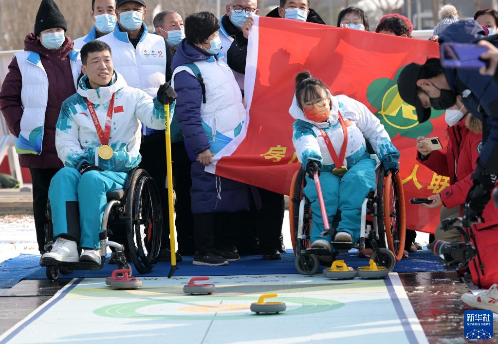 2月7日,北京冬残奥会冠军、中国轮椅冰壶队队员陈建新(前左)和队友闫卓在活动上与残疾人朋友一同体验旱地冰壶项目。新华社记者 李贺 摄