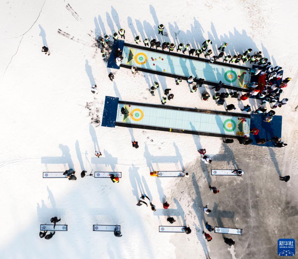 这是2月7日拍摄的旱地冰壶和迷你冰壶的活动现场(无人机照片)。新华社记者 才扬 摄
