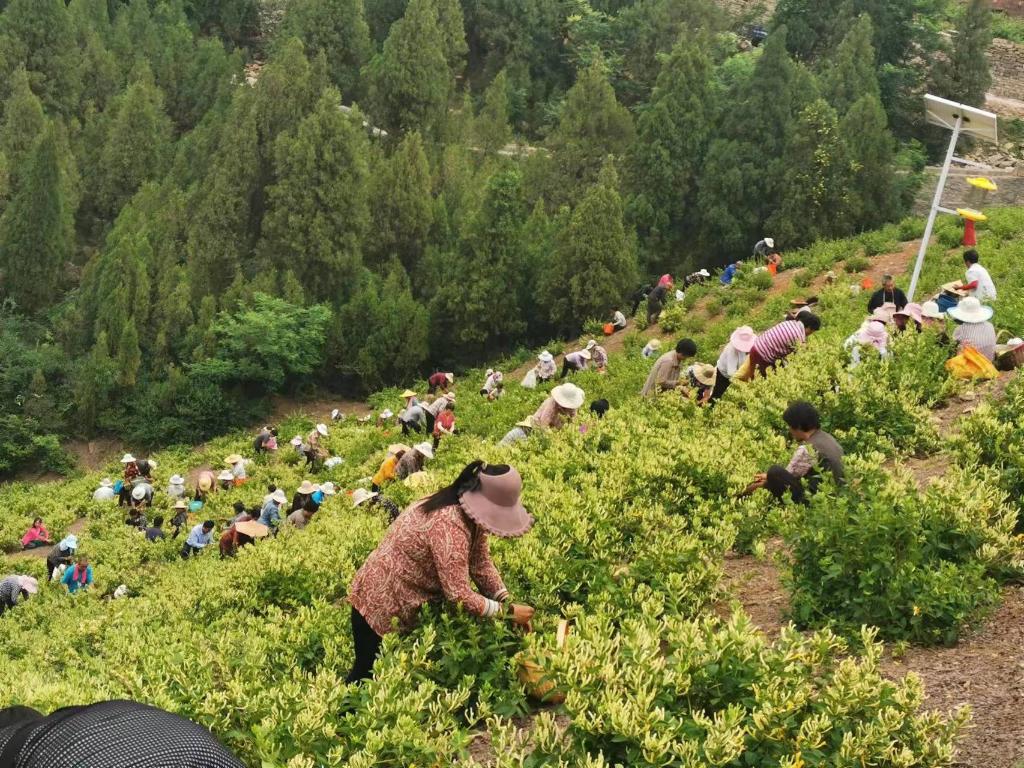 图为春季九间棚村农场里金银花收获的景象。(受访者供图)