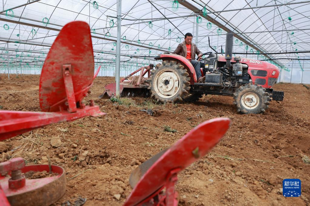 2月8日,贵州省龙里县湾滩河镇园区村村民驾驶农机在大棚里翻耕土地。