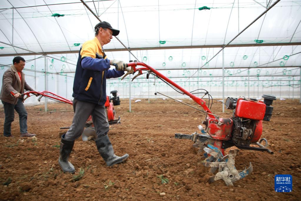 2月8日,贵州省龙里县湾滩河镇园区村村民使用小型农机在大棚里翻耕土地。