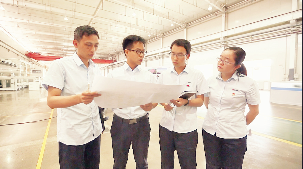 周志军(左二)与团队成员讨论技术问题解决方案。