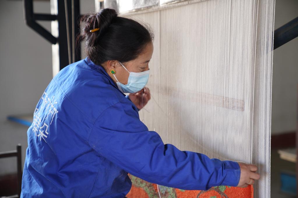 左手持编织杆,右手结扣,打底、栽绒、打线……位于拉萨经开区的西藏帮锦镁朵工贸有限公司藏毯车间内,44岁的次吉细致地完成一道道工序后,一块有着立体图文的特色藏毯铺展开来。“这块藏毯是海外订单,编织精修后就会直接寄往国外客户家中。”次吉说。