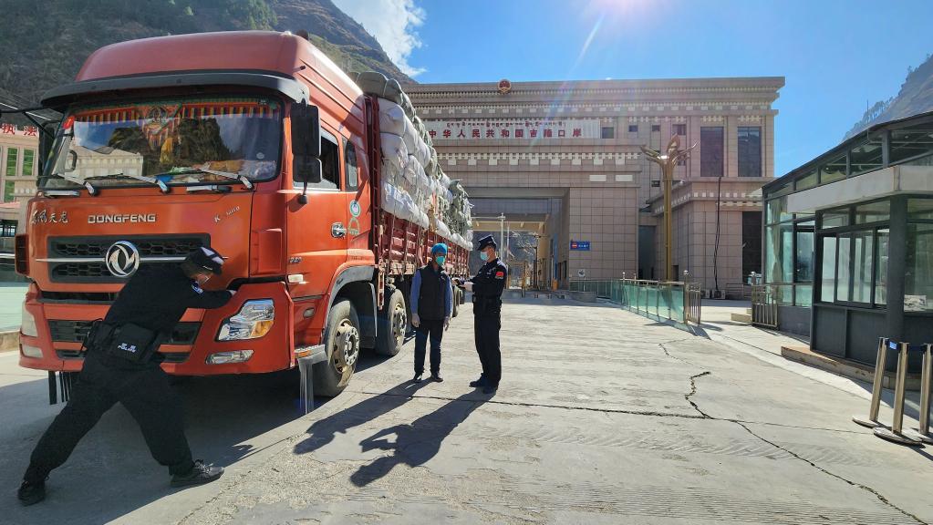 吉隆出入境边防检查站口岸执勤队民警检查出境货车和司乘人员。(新华社发,边巴次仁 摄)