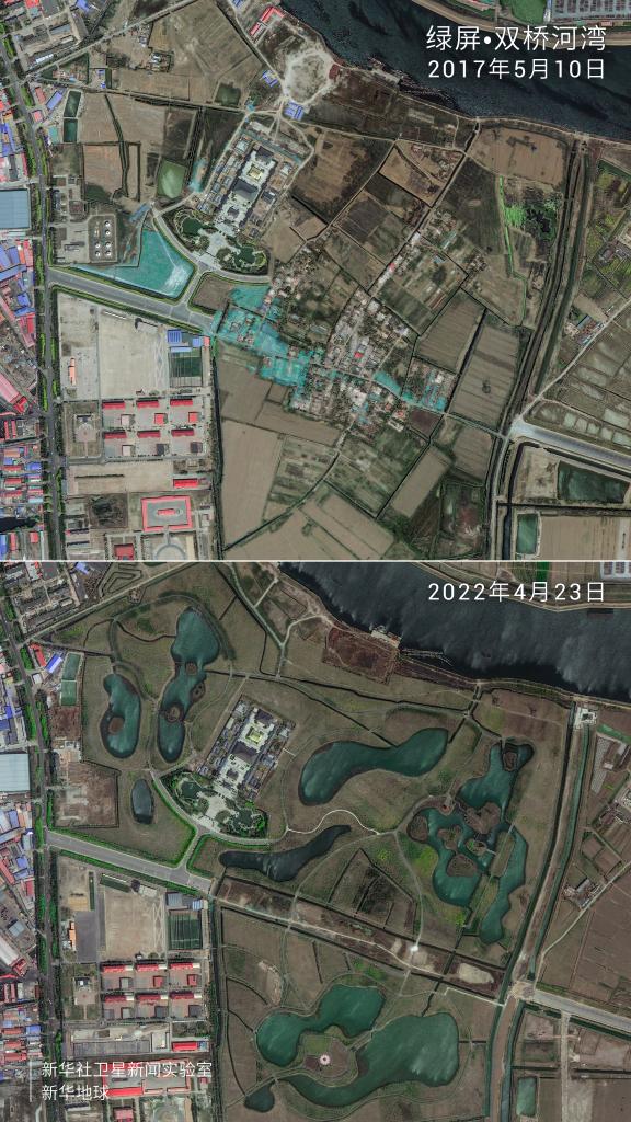 卫星拍摄的绿屏·双桥河湾对比图。