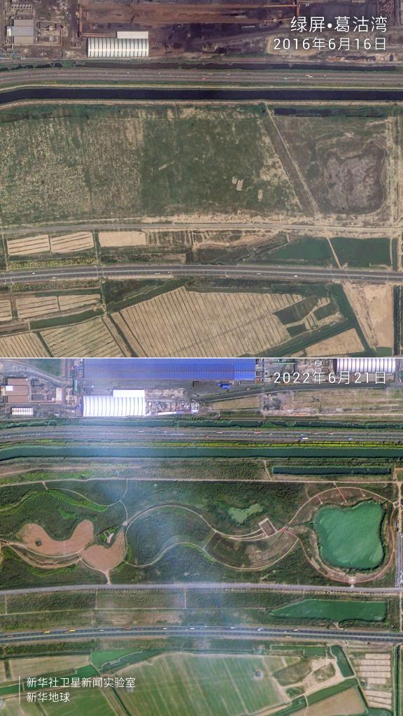 卫星拍摄的绿屏·葛沽湾对比图。