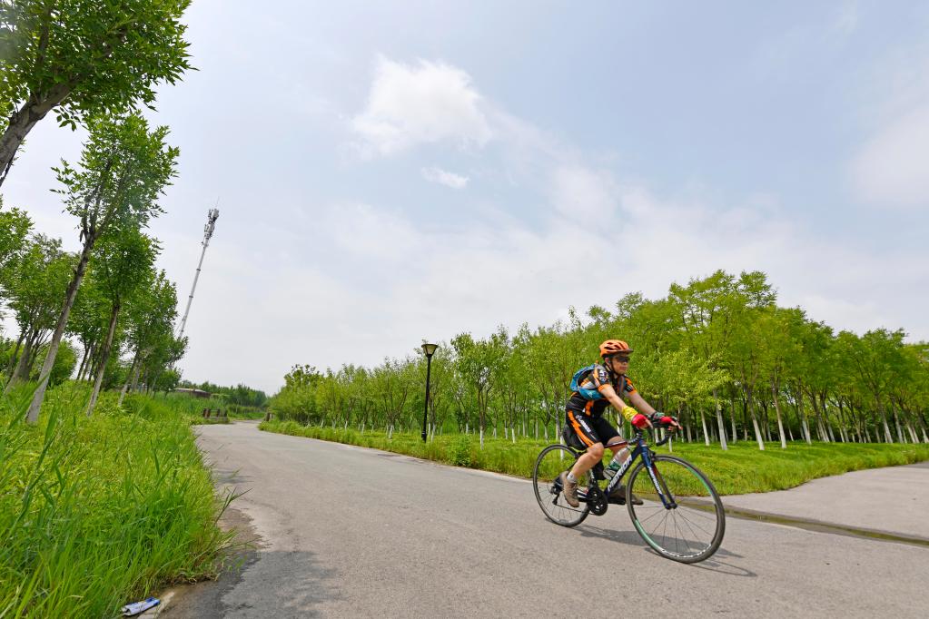游客在天津绿色生态屏障内骑行。新华社记者 赵子硕 摄