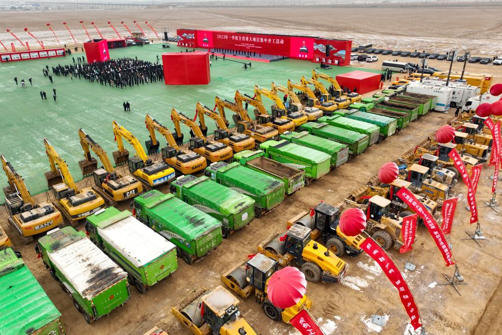 现场的黄土地上仍有部分积雪未消,一排排挖掘机正屹立于寒风之中,整装待发。虽然春寒料峭,但仍让人感受到主会场及视频连线的各市州分会场项目奋进的暖意。