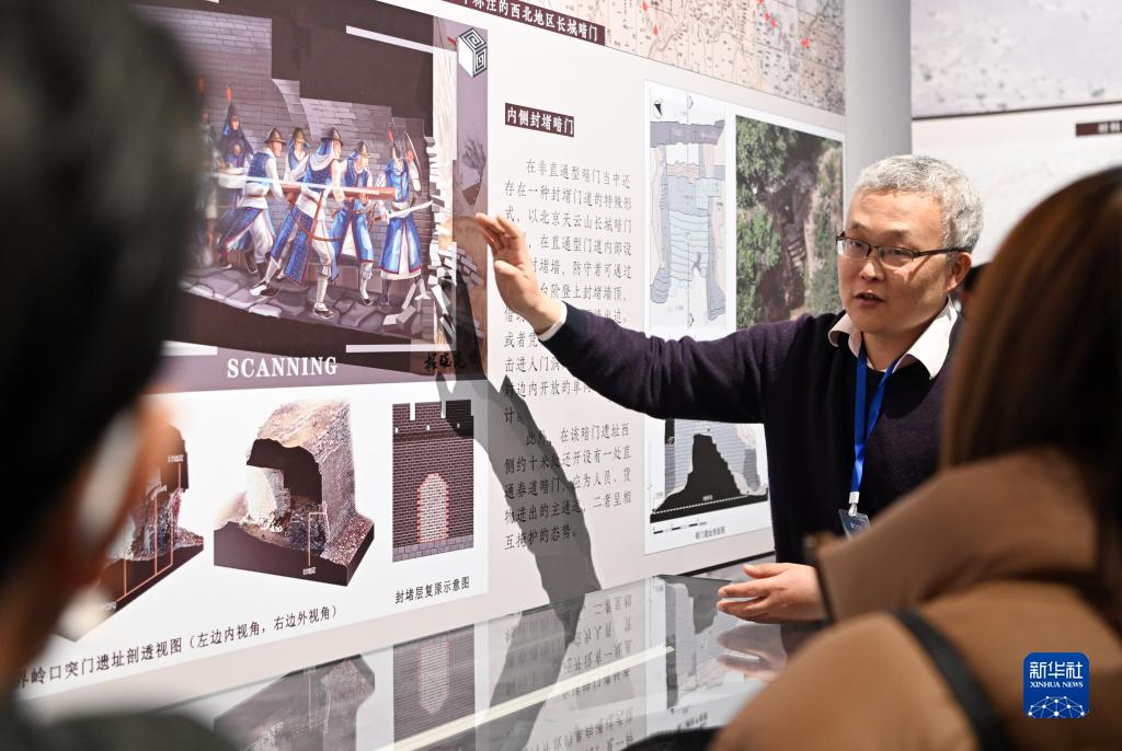 2月12日,天津大学研究团队成员在展览上给观众讲解长城突门。