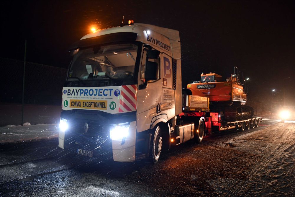 2月6日晚在伊斯坦布尔至安卡拉公路上拍摄的运往灾区的大型机械。