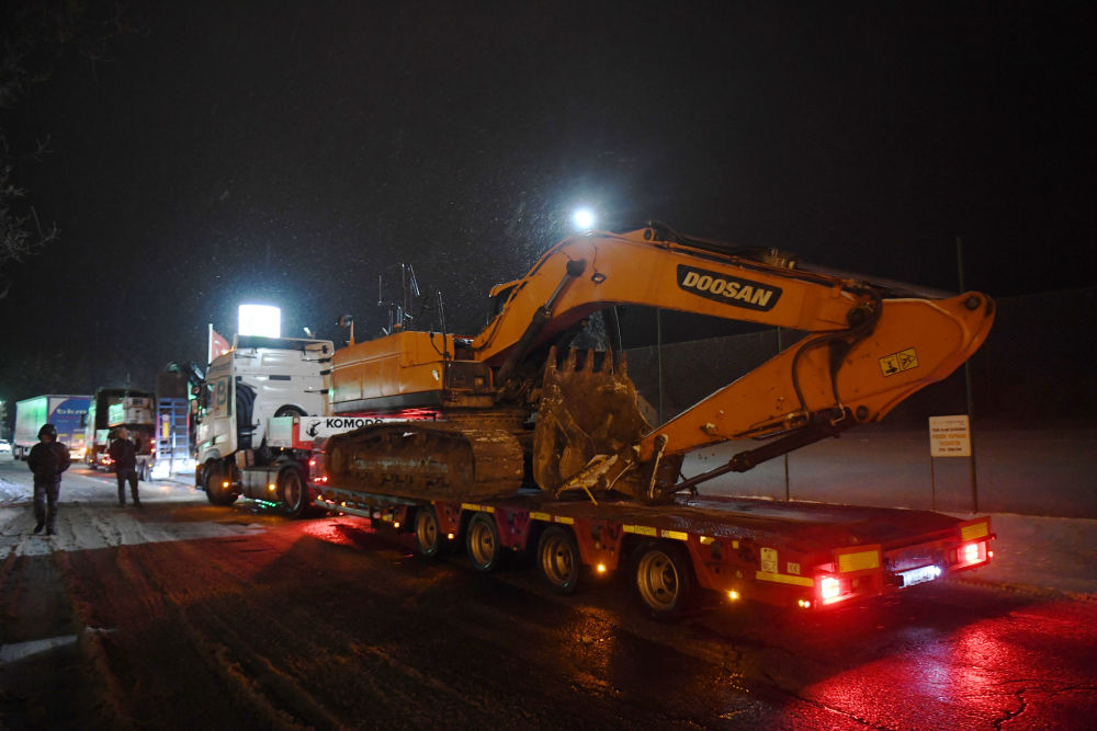 2月6日晚在土耳其伊斯坦布尔至安卡拉公路上拍摄的运往灾区的大型机械。