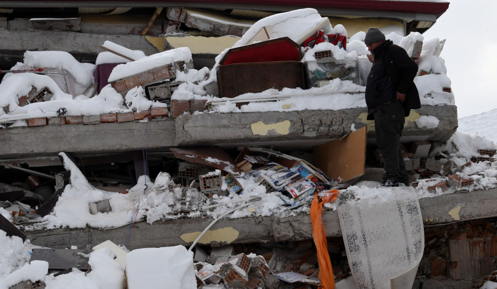 2月7日,在埃尔比斯坦地区,一名男子查看地震中受损的建筑物。