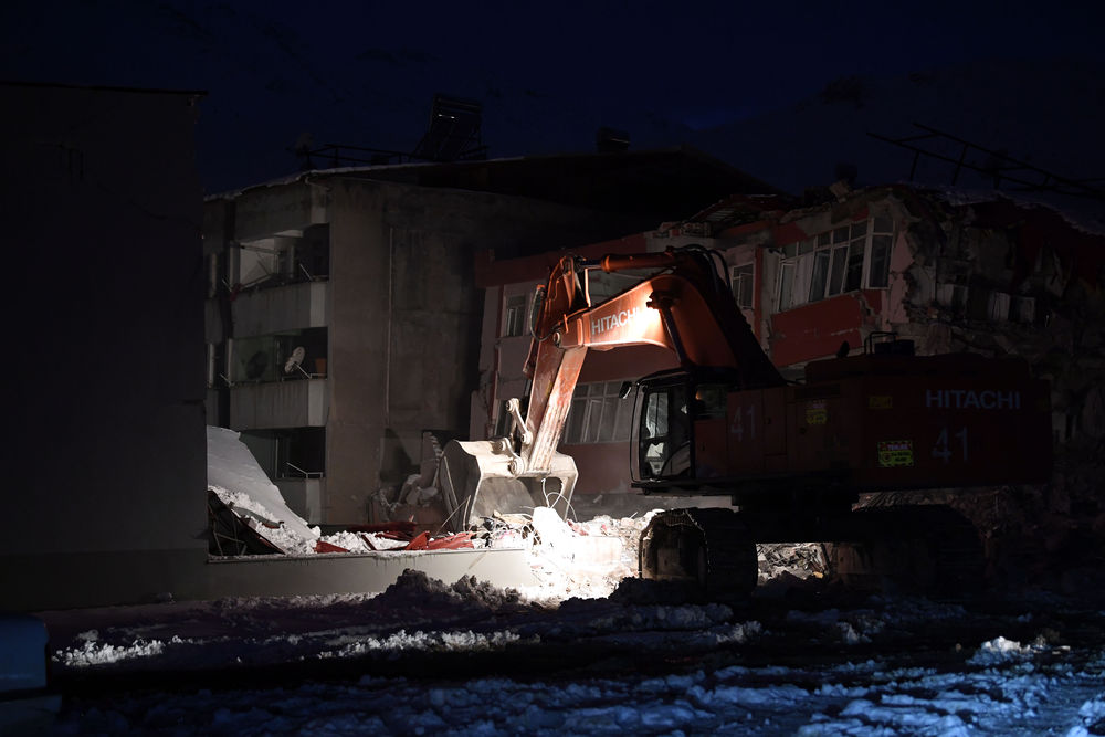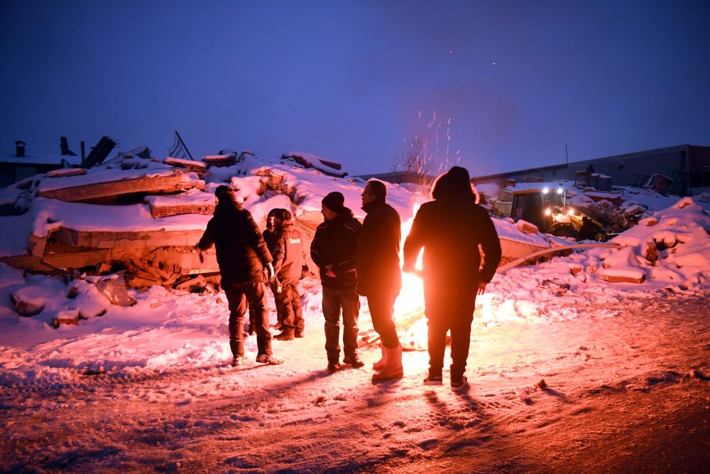 2月7日晚,在埃尔比斯坦地区,救援人员在废墟旁烧火取暖。