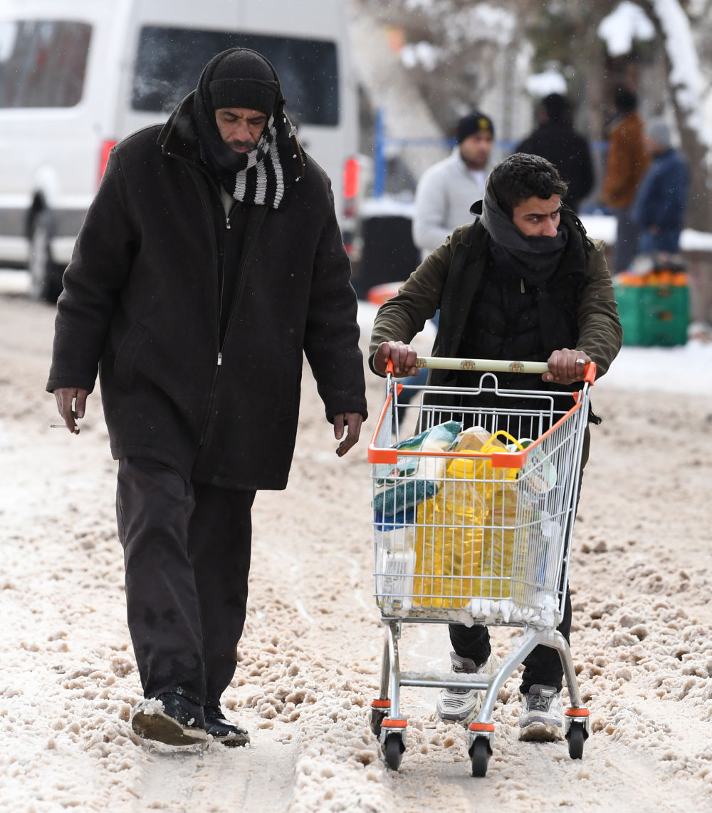 2月7日,在埃尔比斯坦地区,当地居民在街头运输物资。