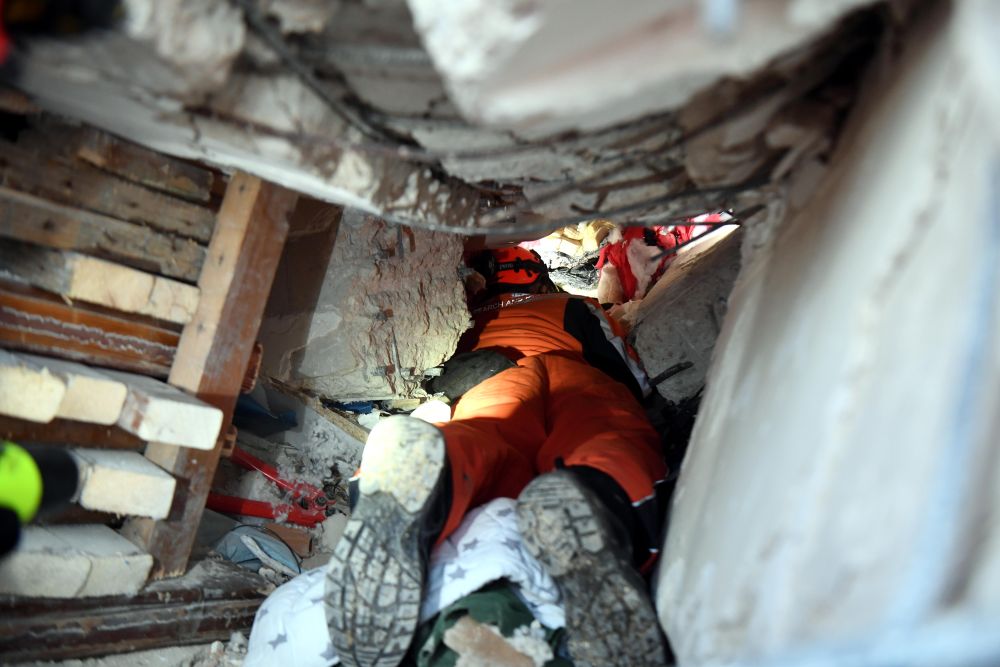 2月7日,在埃尔比斯坦地区,救援人员在一处地震废墟搜救。