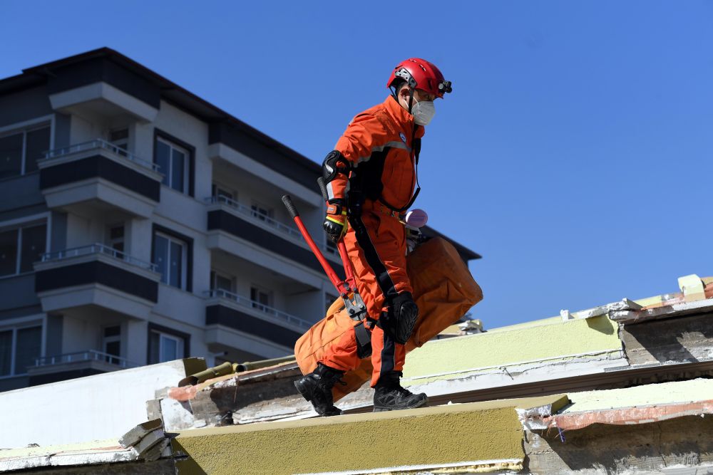 2月8日,中国救援队队员在哈塔伊的一处地震废墟搜救。