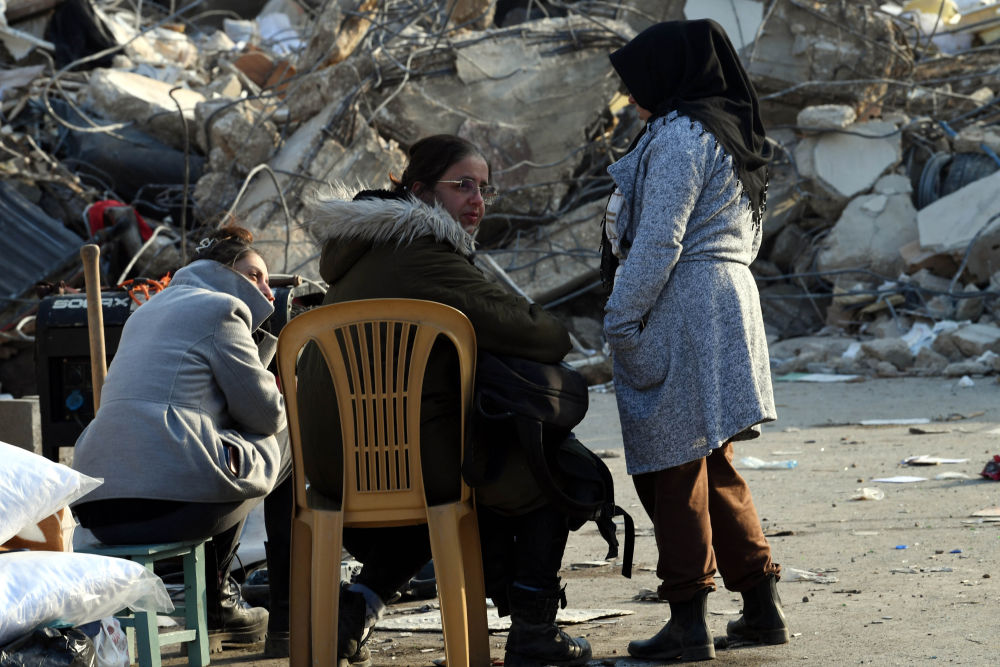 2月10日,人们聚集在安塔基亚市的一处地震废墟旁。