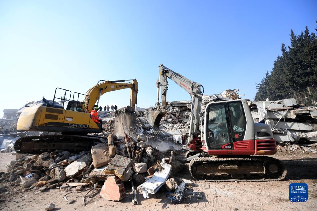 2月12日,大型机械在土耳其哈塔伊省安塔基亚市一处地震废墟中作业。