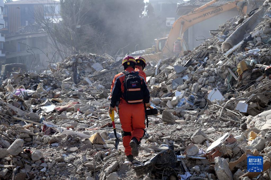 2月12日,中国救援队队员在土耳其哈塔伊省安塔基亚市一处地震废墟开展救援工作。