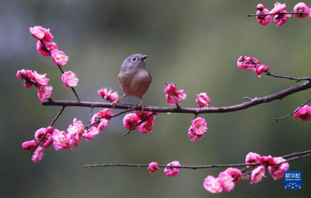2月12日,在湖南省衡阳市雁峰区五星村,小鸟在梅花枝头停留。