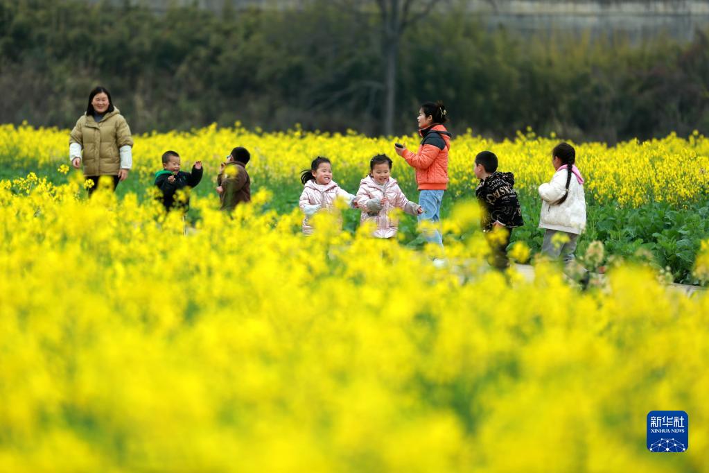 2月12日,游人在贵州省都匀市小围寨街道马尾村油菜花田游玩。