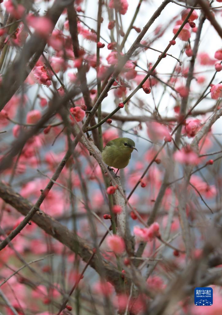 2月12日,鸟儿在贵州省铜仁市江口县太平镇云舍村湿地公园梅花丛中栖息。