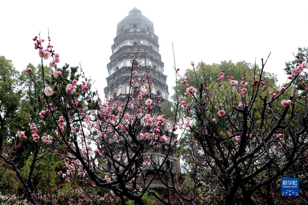 2月12日,苏州虎丘山景区绽放梅花与古塔相映成景。
