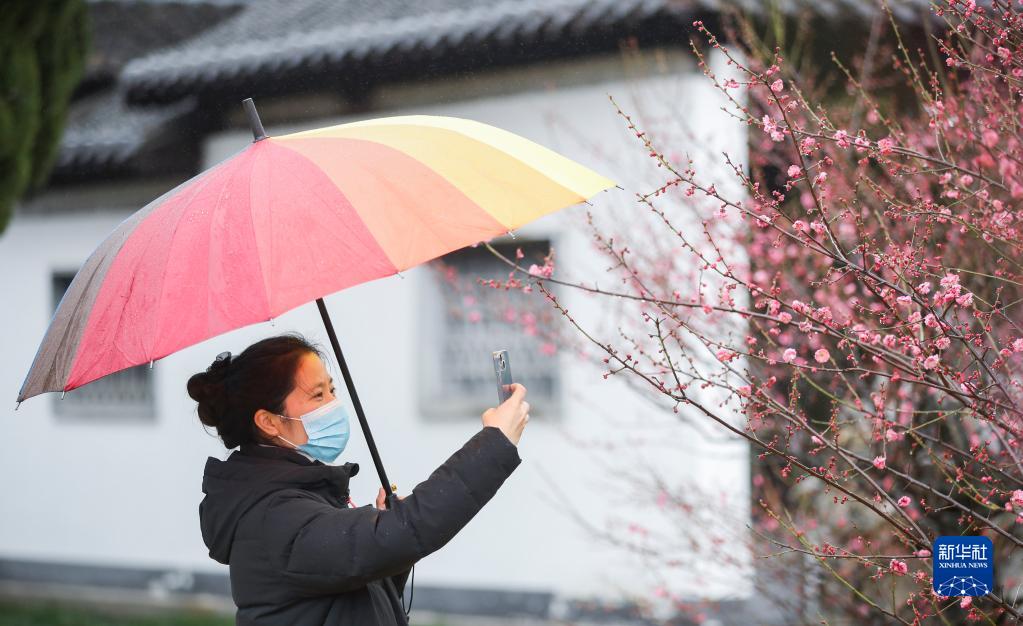 2月12日,游客在江苏淮安清晏园欣赏梅花。
