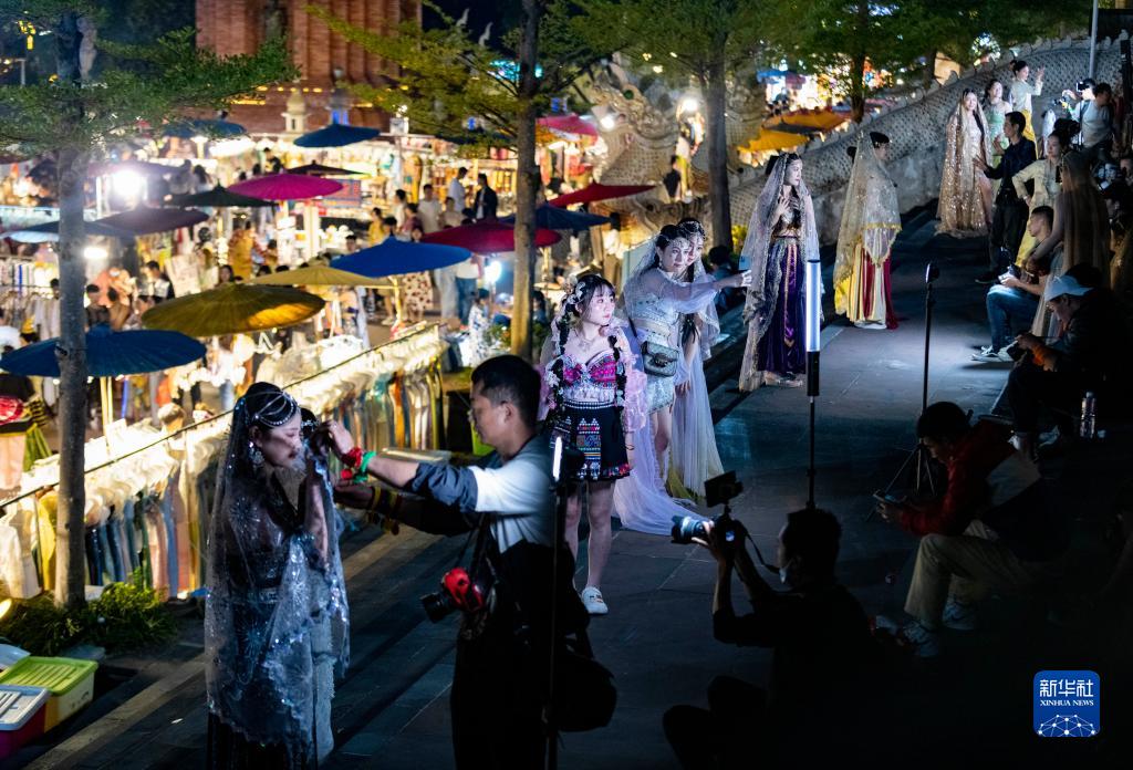 夜幕降临,位于云南省西双版纳傣族自治州景洪市的告庄西双景星光夜市流光溢彩,游人如织。富有民族风情的旅拍受到游客青睐,成为热门体验项目,拉动城市“夜经济”发展。