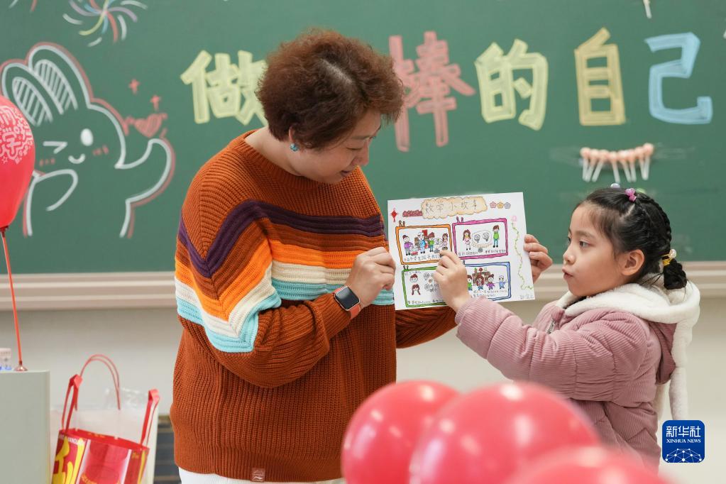 2月13日,在北京市朝阳区芳草地国际学校远洋小学,一年级三班的学生郭宜之(右)在展示寒假作业。
