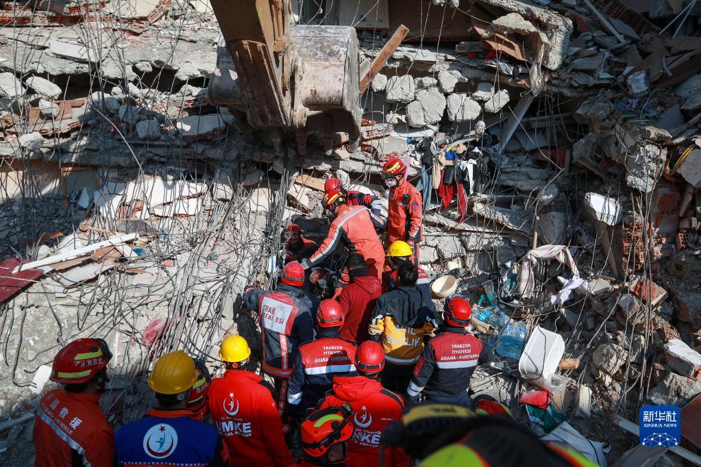 2月12日,在土耳其哈塔伊省安塔基亚市,中土两国救援队队员在地震废墟中搜救。