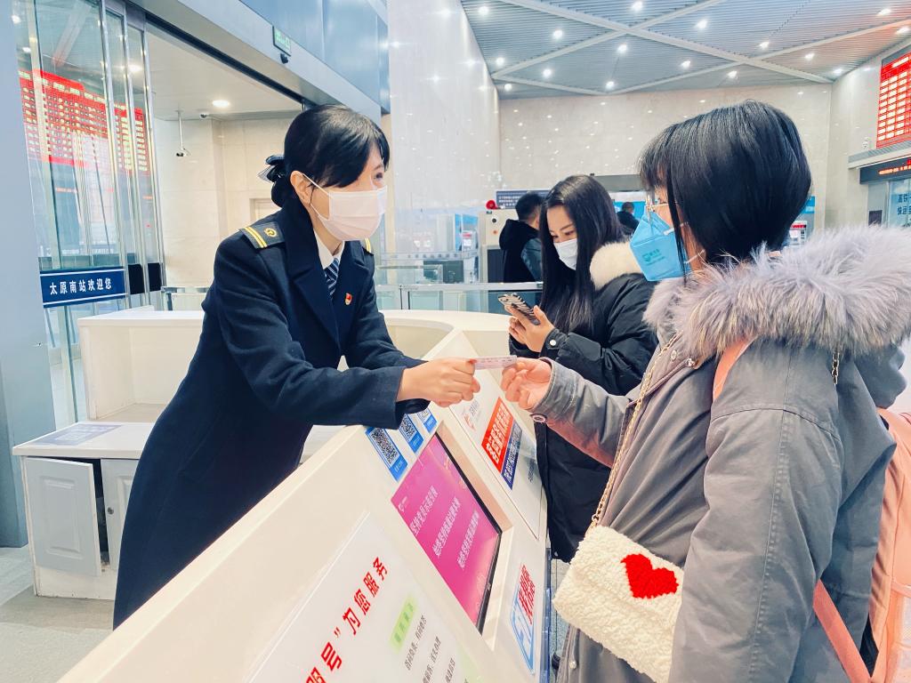 “您这种情况可以网上办理,不用去窗口排队。您点开手机软件,我来帮您操作。”太原南高铁站的导购台前,导购员李静正在帮助旅客处理票务问题。