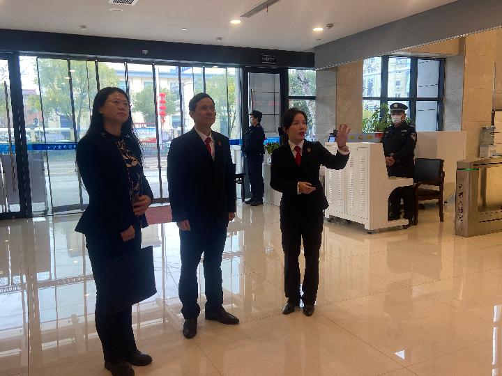 陈玮(左一)在衢州市中级人民法院走访调研。(新华社记者黄筱 摄)