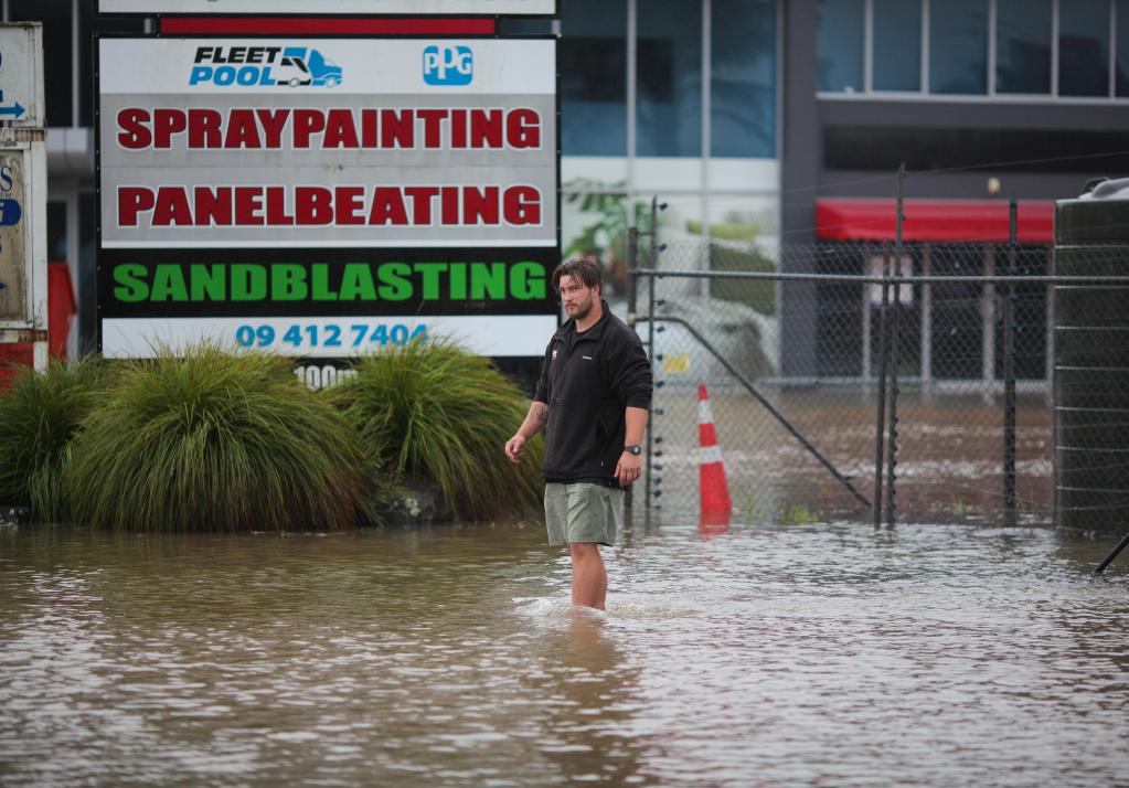 2月14日,在新西兰奥克兰,一名男子站在积水中。新华社发(赵纲摄)