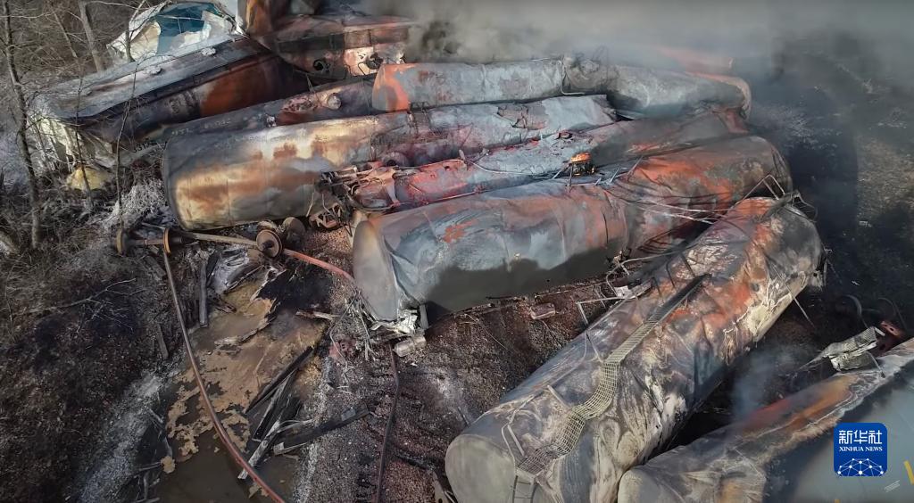 这张美国国家运输安全委员会发布的无人机视频截图显示的是有毒化学品运载列车脱轨事故现场。新华社发