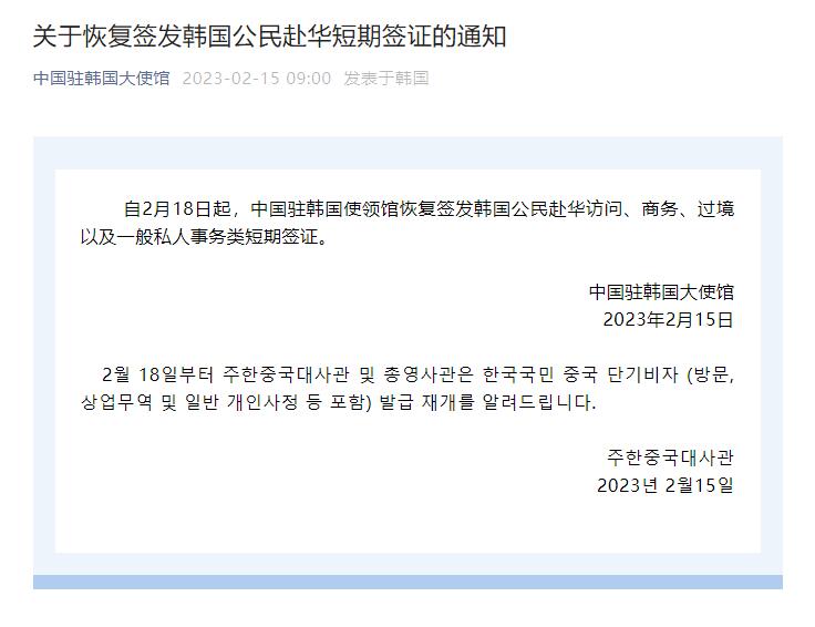 自2月18日起,中国驻韩国使领馆恢复签发韩国公民赴华访问、商务、过境以及一般私人事务类短期签证。