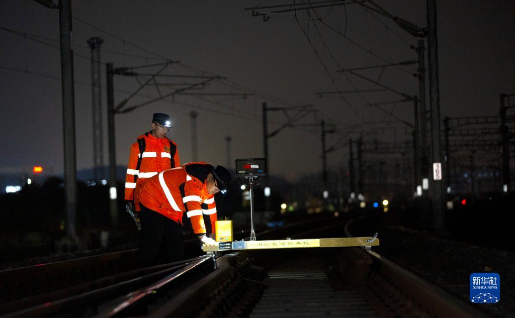 2月15日凌晨,中国铁路上海局集团有限公司南京桥工段的铁路检修人员在南京南站调试轨道检查仪。
