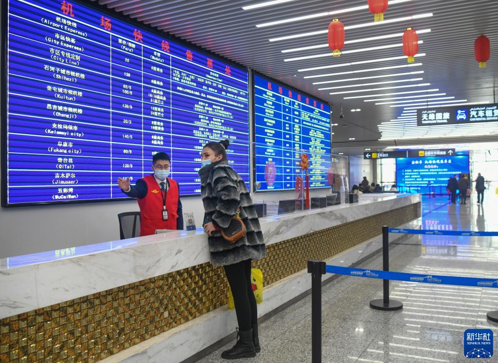 2月15日,在乌鲁木齐地窝堡国际机场空港客运综合枢纽站,旅客咨询机场快线乘车事宜。