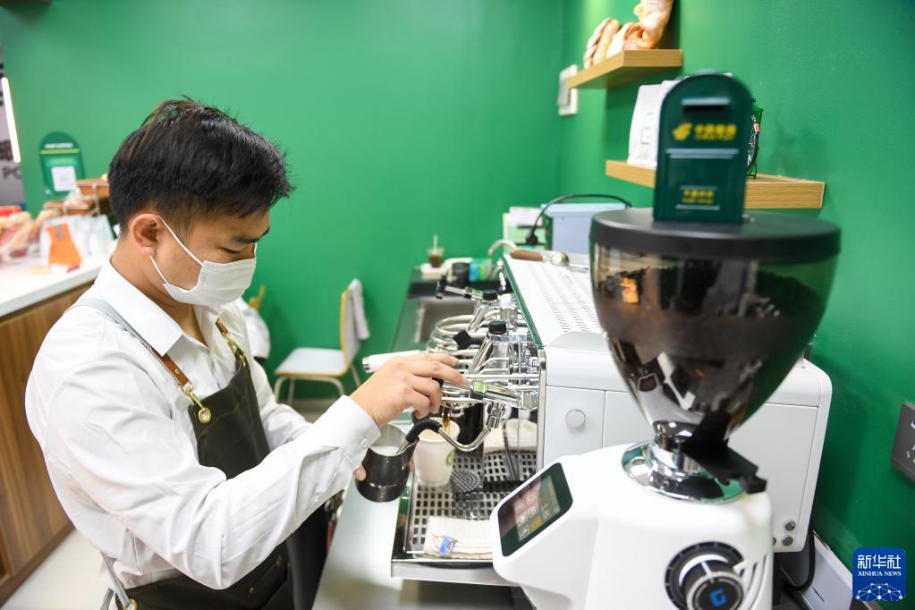 2月15日,咖啡师在深圳咖啡主题邮局制作咖啡。