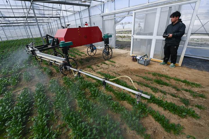 2月15日,在浙江省嘉兴市南湖区凤桥镇一个有机农业园的蔬菜大棚内,工作人员遥控操作植保机器人进行施肥作业。新华社记者 徐昱 摄