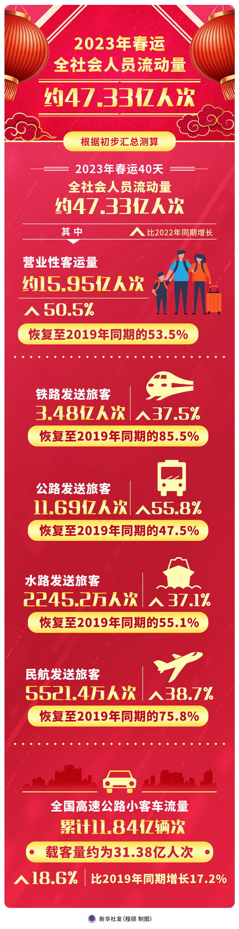 新华社北京2月16日电(记者叶昊鸣、魏弘毅)记者16日从国务院联防联控机制春运工作专班了解到,根据初步汇总测算,2023年春运40天,全社会人员流动量约47.33亿人次。其中,营业性客运量约15.95亿人次,比2022年同期增长50.5%,恢复至2019年同期的53.5%。