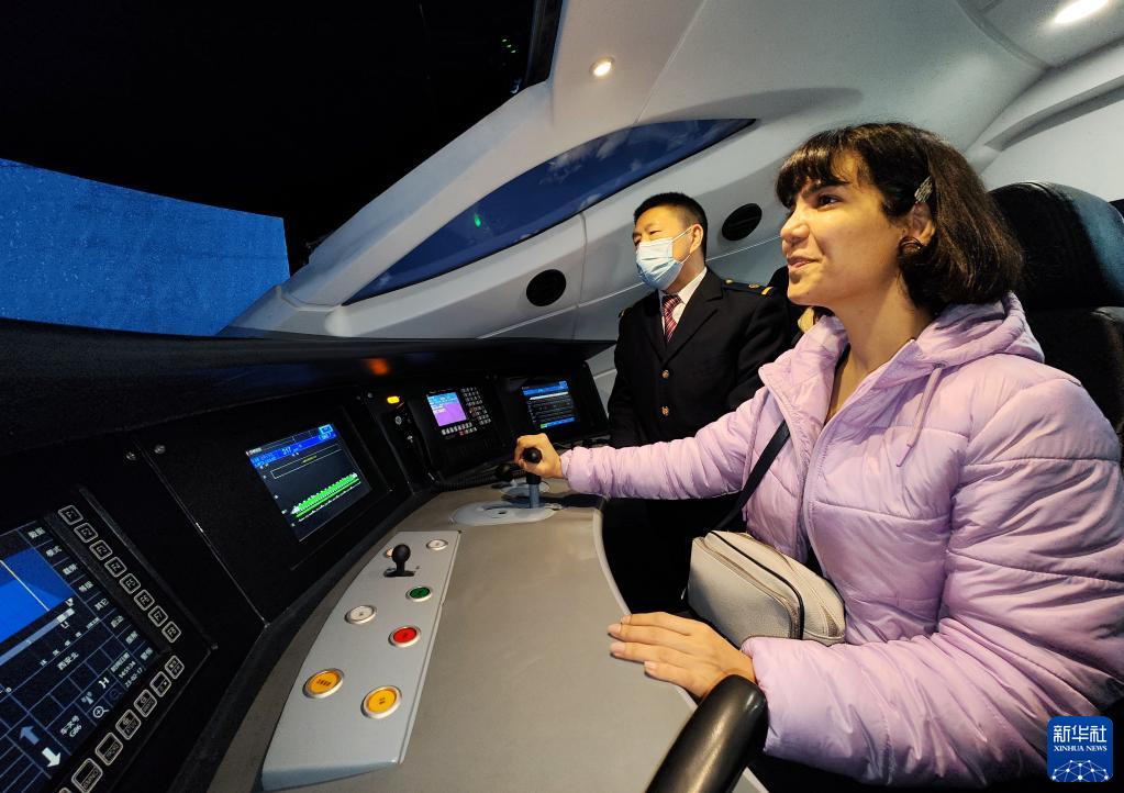 2月17日,在西铁教育培训基地,西安交通大学的伊朗留学生(前)在机务全功能高级模驾区体验中国高铁模拟驾驶。