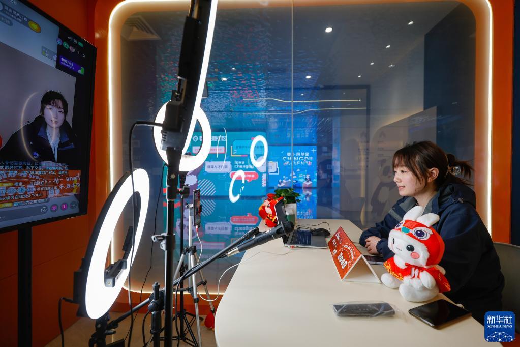 2月17日,在中国成都人力资源服务产业园的直播间里,工作人员通过线上直播的方式,帮助企业公布招聘信息,并解答网友疑问。